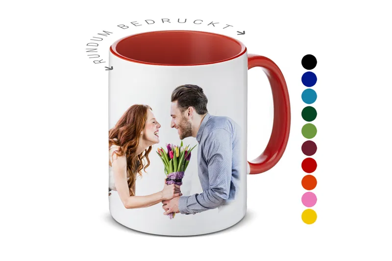 • Druckfläche: 7,8 × 18,5 cm • Tassen-Durchmesser: 8 cm • Tassen-Höhe: 9.5 cm • Tassen-Inhalt: 300 ml • Spülmaschinenfest - Für lange Freude empfehlen wir Handwäsche. • empfohlene Auflösung: 920 × 2190 px (300 dpi) Die Fototasse ist umlaufend bedruckt und bietet die größtmögliche Fläche für eines oder mehrere Bilder. Die Auswahl der 10 Farben für das Innenleben bietet eine zusätzliche Möglichkeit der Individualisierung.