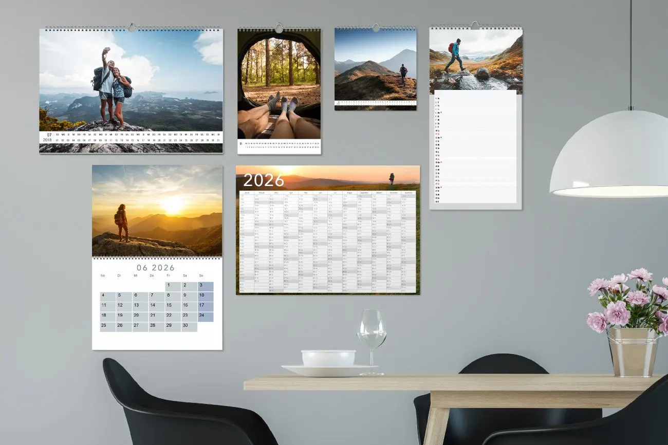 Wand-, Tisch- und Familienkalender in mehreren Formaten (z. B. A4/A3, quadratisch). Verfügbare Größen siehst du auf der Produktseite und im Editor.