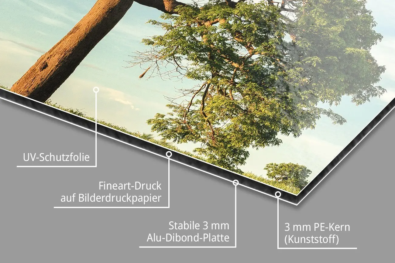 Das Alu-Dibond-Wandbild mit Bilderdruckpapier vereint Eleganz und Stabilität. Die 3 mm starke Alu-Dibond-Platte wird mit dem 12 Farbendruck kaschiert. Zusätzlich wird das Bild noch mit einer hauchdünnen UV-Folie laminiert. Dabei entsteht ein wunderschönes Produkt, welches sich durch Stabiltiät, geringem Gewicht, Langlebigkeit und Formbeständigkeit auszeichnet. Den optional erhältlichen rückseitig angebrachten Alu-Rahmen empfehlen wir ab einer Länge von 50 cm. Er beugt einer eventuellen natürlichen Wölbung vor und kann zusätzlich als Aufhängesystem dienen. Daneben sorgt der Alu-Rahmen für eine frei schwebende Optik und kann so z.B. auch für eine LED-Hintergrundbeleuchtung genutzt werden.